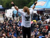Publikum für seine Aufforderung zu gewinnen, sich hinzusetzen.